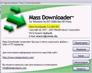 MetaProducts Mass Downloader (MD) качает выбранные вами файлы (или список файлов) с Web и FTP сайтов с максимально возможной скоростью. Технология разбиения файла на несколько фрагментов и одновременной работы над каждым из них существенно уменьшает время скачивания. Программа сама может соединиться с провайдером, закачать файл и отключиться!