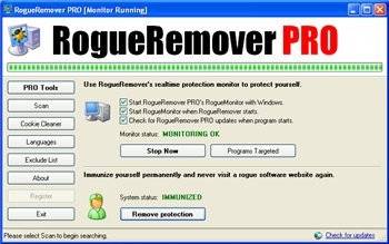 RogueRemover PRO предназначена для борьбы с ложными антишпионскими и антивирусными приложениями. Данная программа имеет маленький размер и проста в использовании. RogueRemover PRO позволяет обнаруживать и удалять установленные в системе программы, которые создают видимость борьбы с вредоносными модулями, в то время, как сами собирают персональную информацию или рекламируют какое-либо программное обеспечение. При этом их нельзя удалить стандартными средствами, так как их деинсталляторы обычно не работают. RogueRemover PRO способен находить большинство подобных программ, приводя по каждой программе информацию о степени опасности и краткое описание. Обновление базы данных программы дает более надежную защиту вашего компьютера.